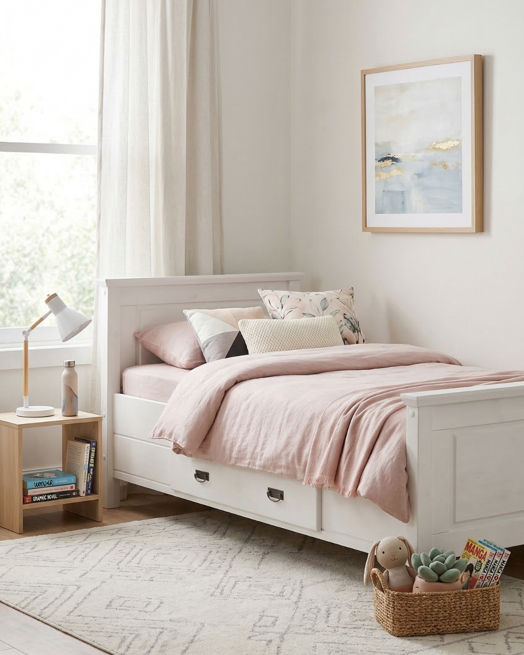 Voodi ühel küljel on sahtel, kuhu saab mugavalt paigutada asju.